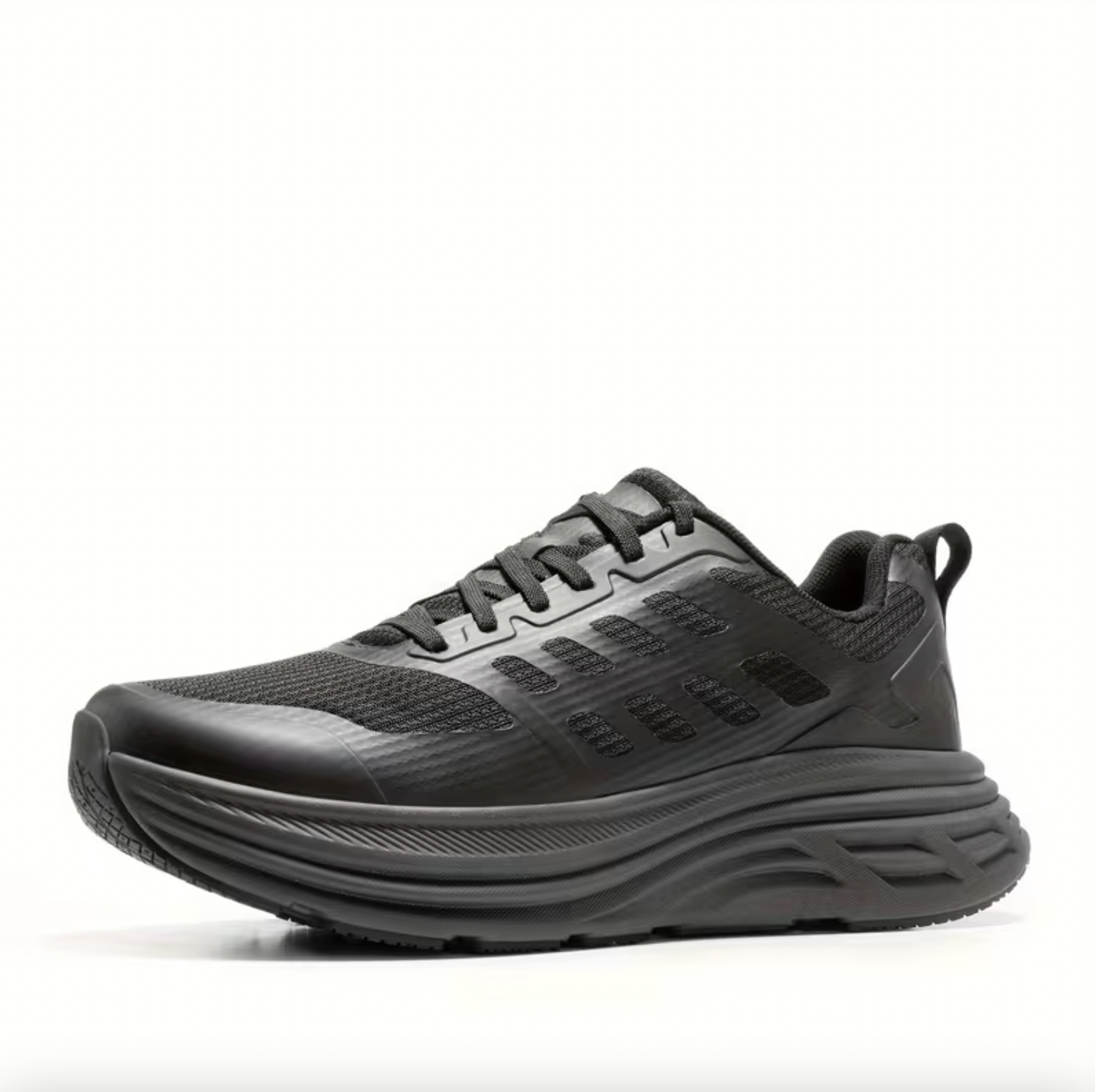 This all-black performance sneaker was designed to deliver reliable comfort, durability, and stability for everyday wear and active movement. Built with a breathable engineered mesh upper, the shoe provides continuous airflow while maintaining a lightweight and supportive structure that adapts naturally to the shape of the foot.